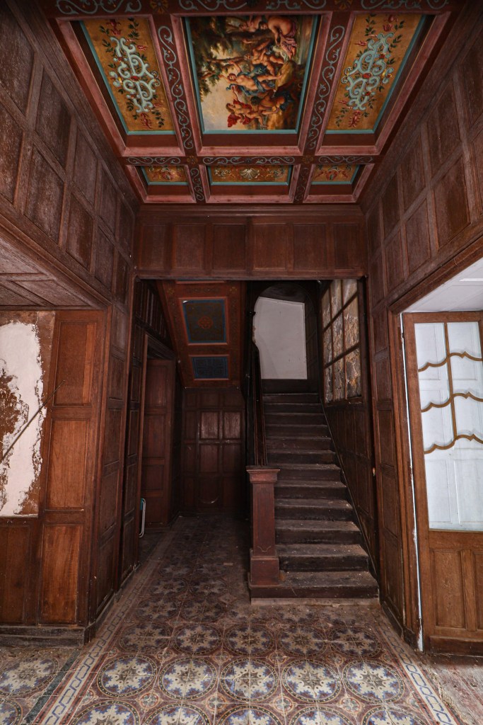 Plusieurs fois remanié au fil des années, il tombe peu à peu dans l’oubli. Peu de choses intéressantes à l’intérieur si ce n’est cette merveilleuse cheminée sculptée et ces peintures au plafond avant d’emprunter les escaliers.