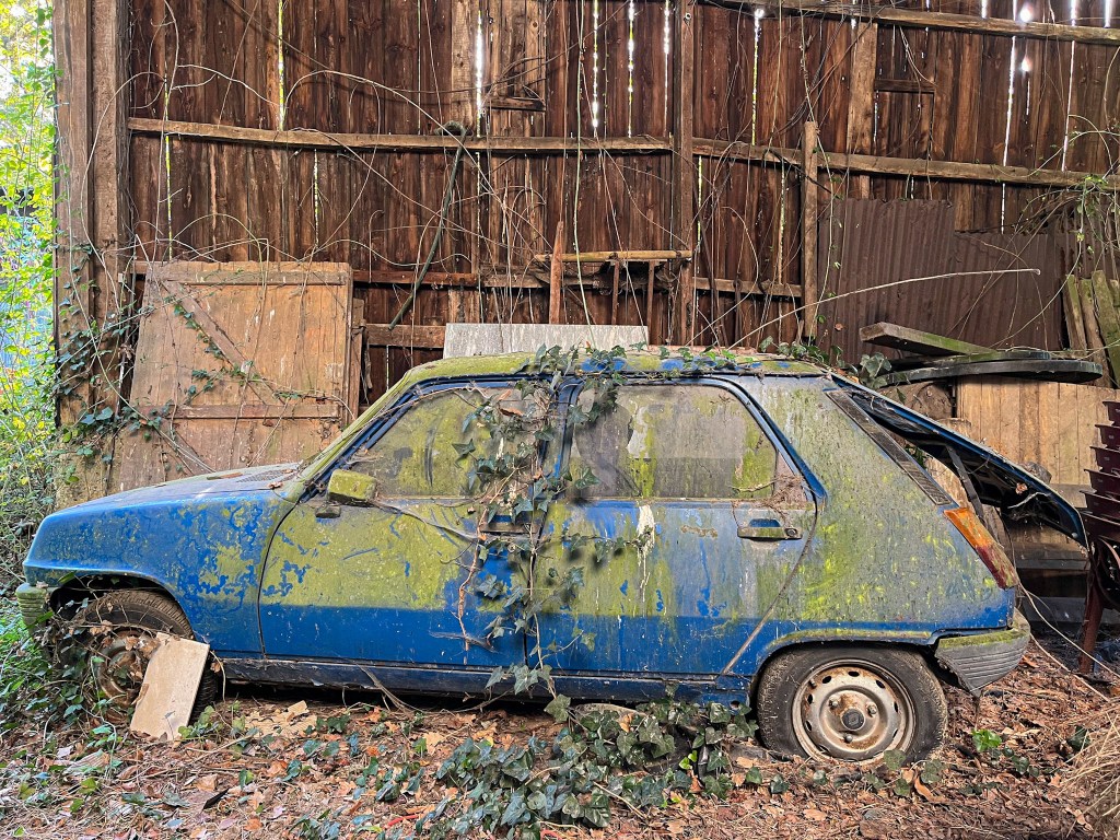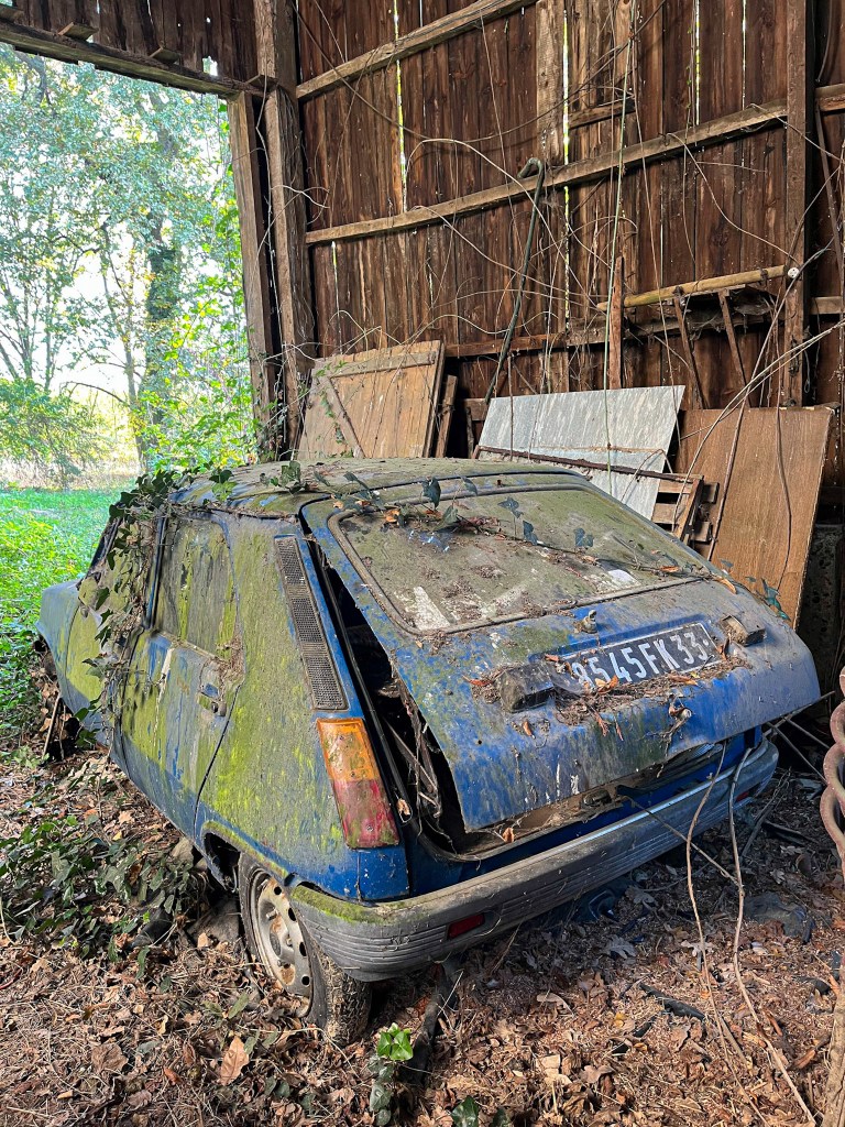 Découverte d’une Renault 5 délaissée au fond d’une grange.